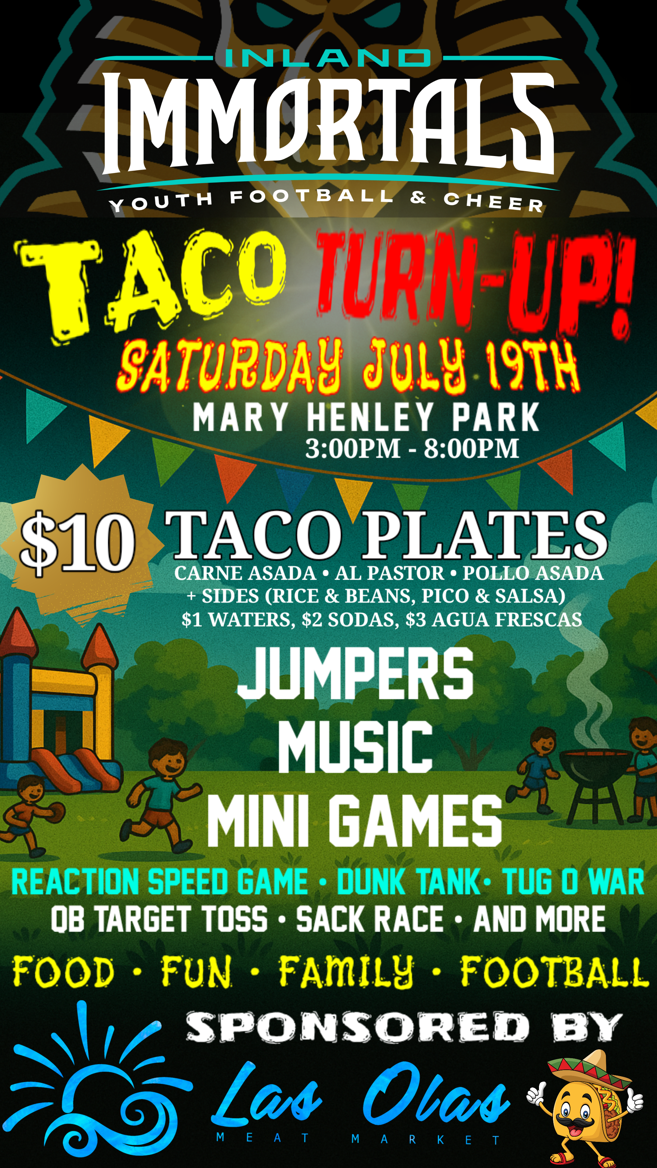 The Inland Immortals Youth Football & Cheer organization is inviting families and community members out for an evening of food, fun, and football at their upcoming “Taco Turn-Up” community event on Saturday, July 19th at Mary Henley Park from 3:00 PM to 8:00 PM.