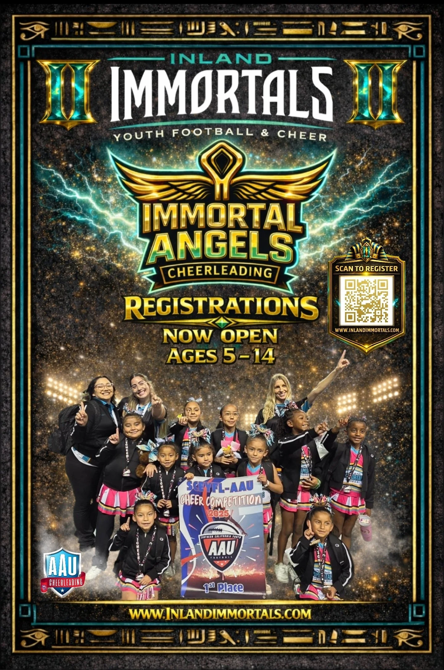 The Inland Immortals Cheer program celebrated a major milestone in 2025 as the Immortal Angels Cheer squads delivered an incredible performance at the SCEYFL Cheer Championships, an event sanctioned by the Amateur Athletic Union and featuring some of the top youth cheer teams from across Southern California.